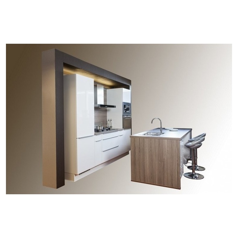 Het kookgedeelte incl. de hoge kasten is 270cm lang, het eiland is 220x96cm.