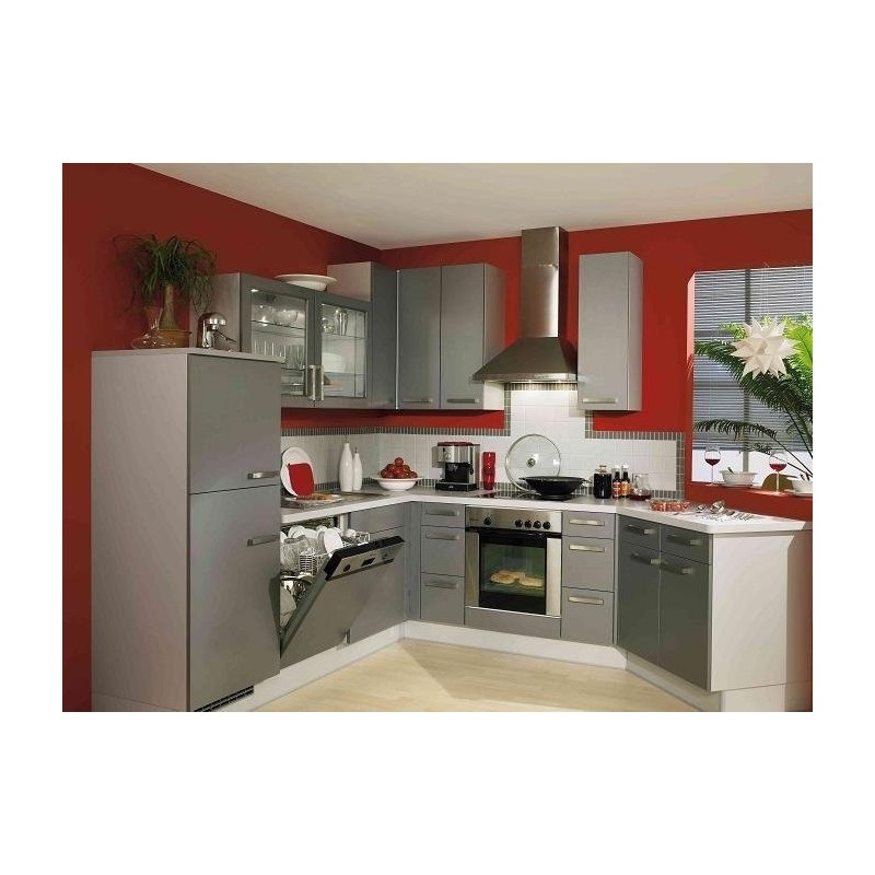 Vaatwasser, koelkast en oven en keramische kookplaat en schouwkap.