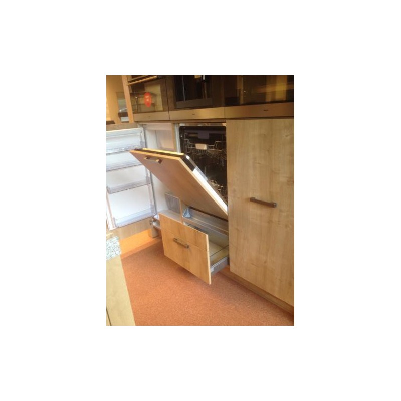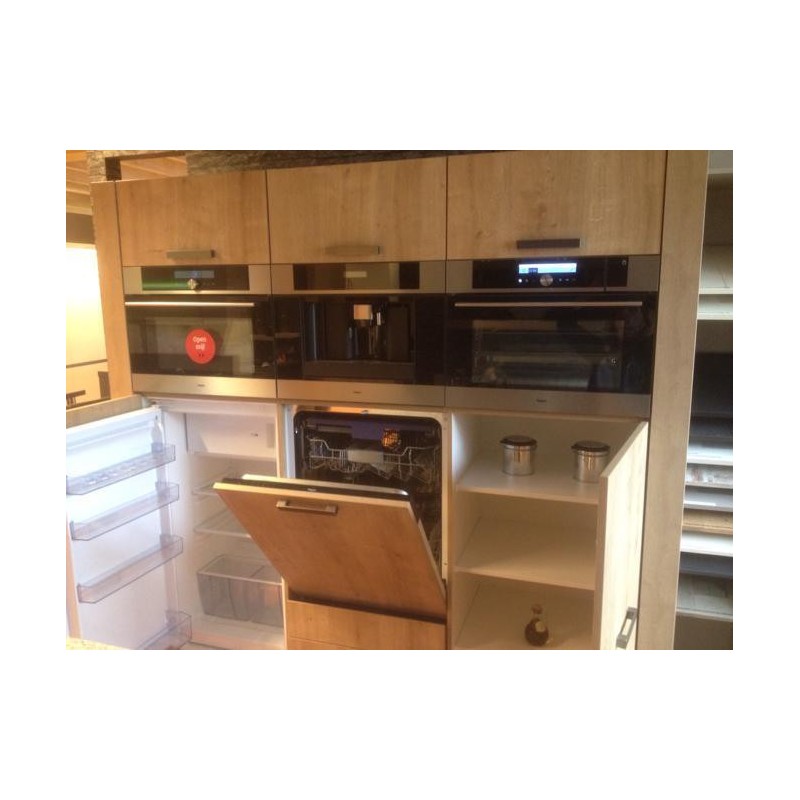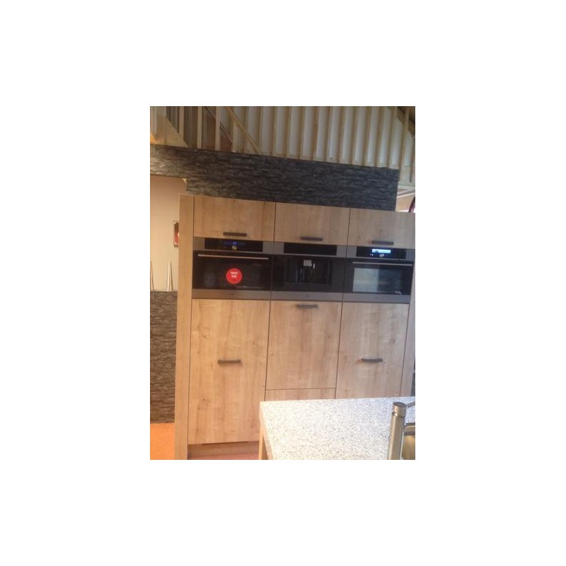 Deze luxe hoogglans greeploze keuken incl. bosch-apparatuur: grote koelkast, combi-magnetron, vol automatische inbouwkoffiezetter, vaatwasser, gaskookplaat met wokbrander en franke afzuigkap. Verder is deze keuken voorzien van een kookeiland, met 120cm brede pannenlades en in het eiland zitten ook spoelbak en kraan in verwerkt. Het werkblad is van graniet. Aan de achterzijde van het eiland zit ook nog kastruimte en een nisje met graniet. Kortom: van alle luxe voorzien. De kastenwand is 250cm breed. Het eiland is 250 x 92cm